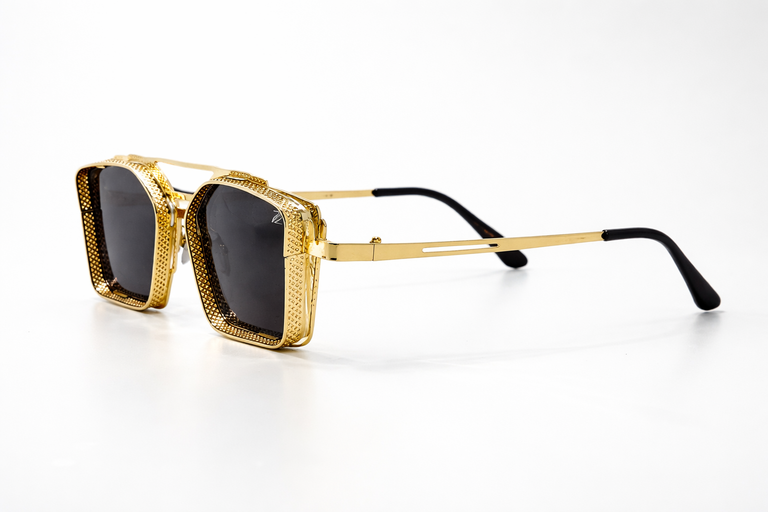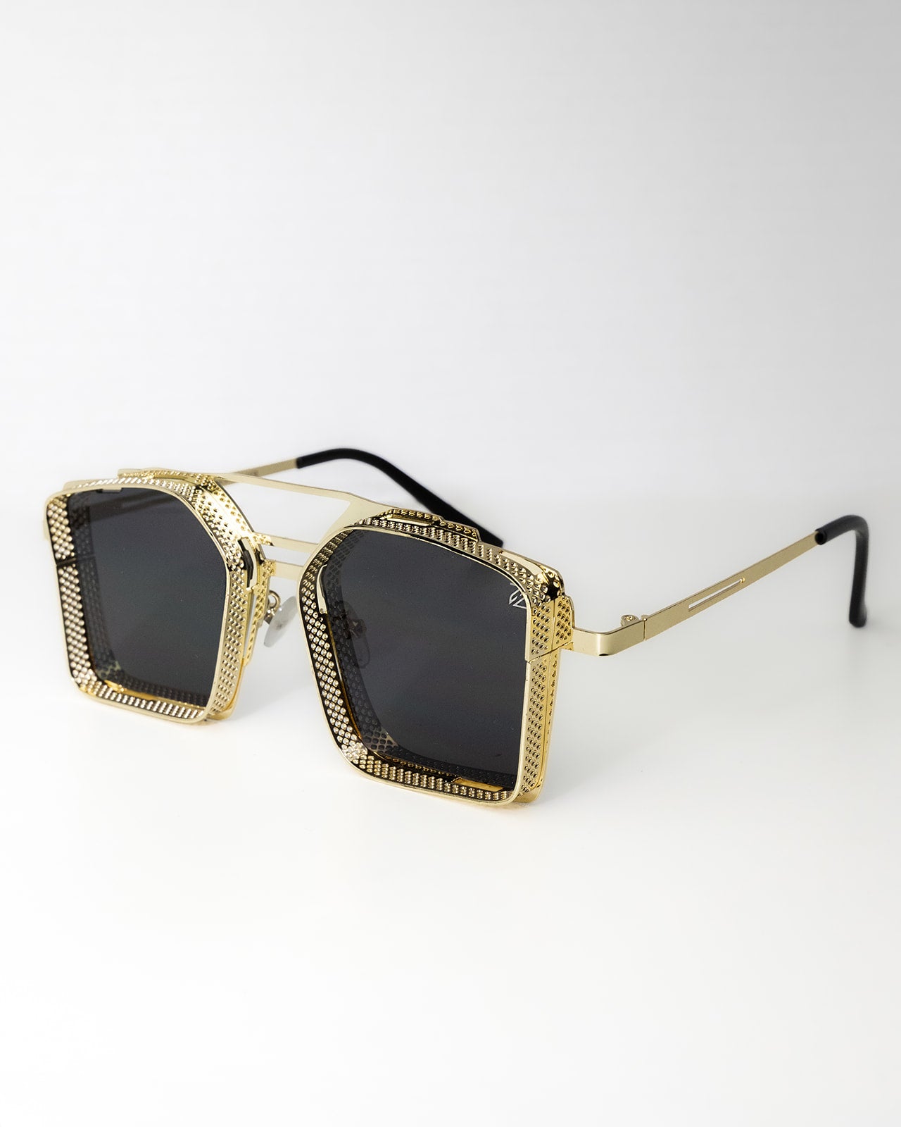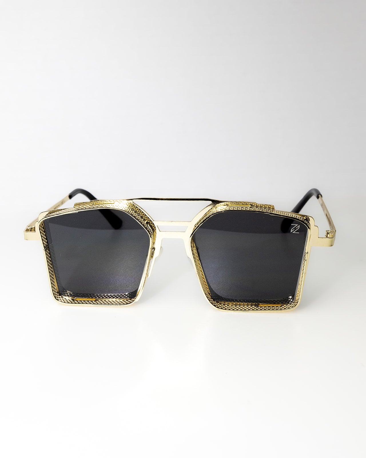 Every detail of the frame reflects precision craftsmanship — from the intricate textured gold finish to the strong architectural bridge that gives the frame its unmistakable character. The dark premium lenses complete the look, delivering both protection and a commanding aesthetic.